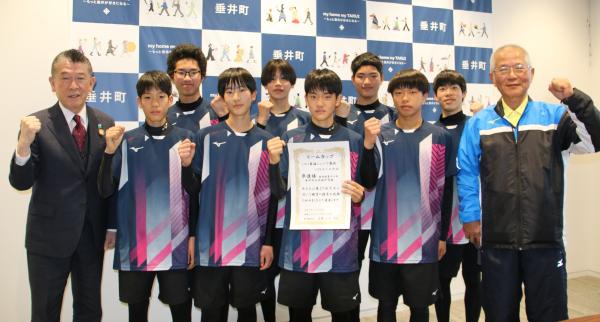 3月29日から31日にかけて三重県で開催される「第9回全国ミズノカップジュニア選抜ソフトテニス選手権大会」に出場する、不破中学校ソフトテニス部の選手の皆さんと監督の高木 隆司さんが早野町長を訪問しました。