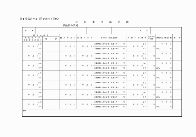 第9条の6 新たに条例第11条の2第1項の職員たる要件を具備するに至った職員は、当該要件を具備していることを証明する書類を添付して、住居届(別記第1号様式の2の2)によりその居住の実情を速やかに任命権者に届け出なければならない。住居手当を受けている職員の住居、家賃の額等に変更があった場合についても、同様とする。