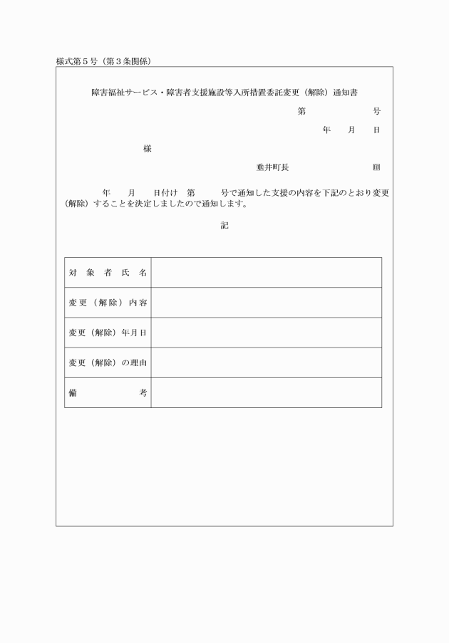 第5条 知的障害者は、職親へ援護の委託を希望するときは、別記様式第12号による知的障害者職親委託申込書を、町長に提出しなければならない。