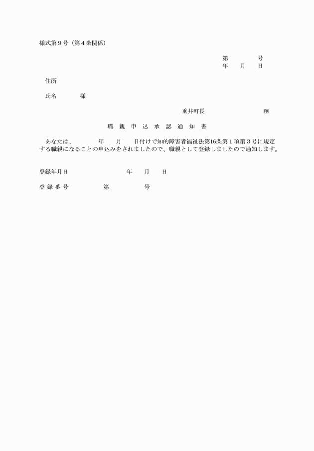 第4条 施行規則第1条の規定による職親になることを希望する者は、別記様式第7号による知的障害者職親申込書により、申し出るものとする。