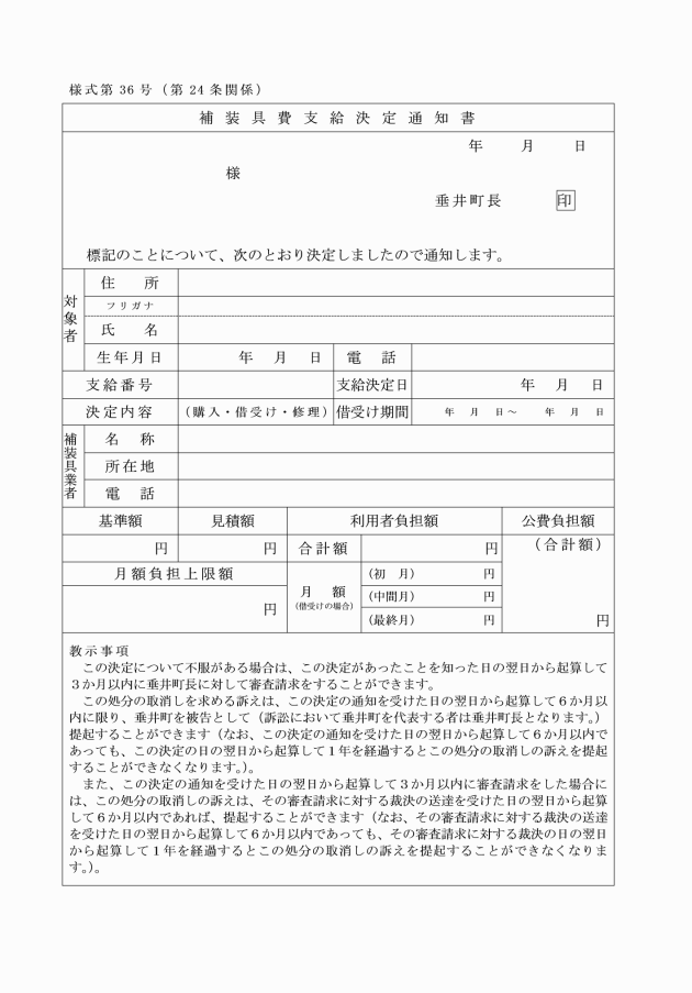 2 町長は、前項の申請に対し支給決定を行ったときは、補装具費支給決定通知書(別記様式第36号)により申請者に通知するとともに、補装具費支給券(別記様式第37号)を交付するものとする。この場合において、借受けの申請に対し支給決定を行ったときは、借受けを行う月数分の補装具支給券(借受け期間分)(別記様式第37号の2)及び補装具支給券(借受け期間終了分)(別記様式第37号の3)を併せて交付するものとする。