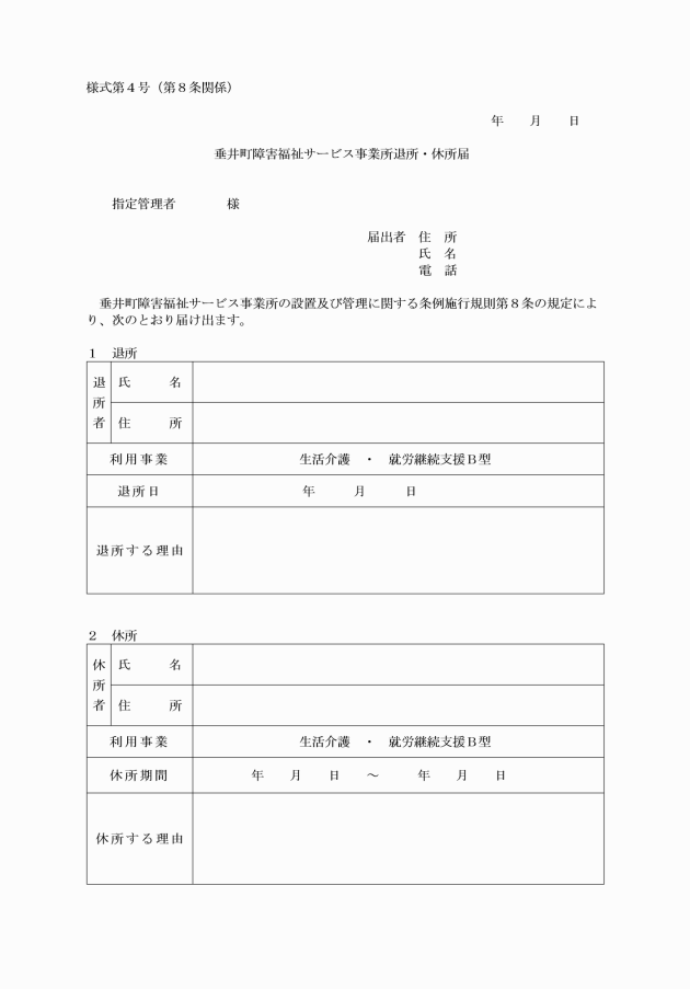 第8条 利用の承認を受けた者は、疾病その他やむを得ない理由により退所又は休所するときは、垂井町障害福祉サービス事業所退所・休所届(別記様式第4号)を指定管理者に提出しなければならない。