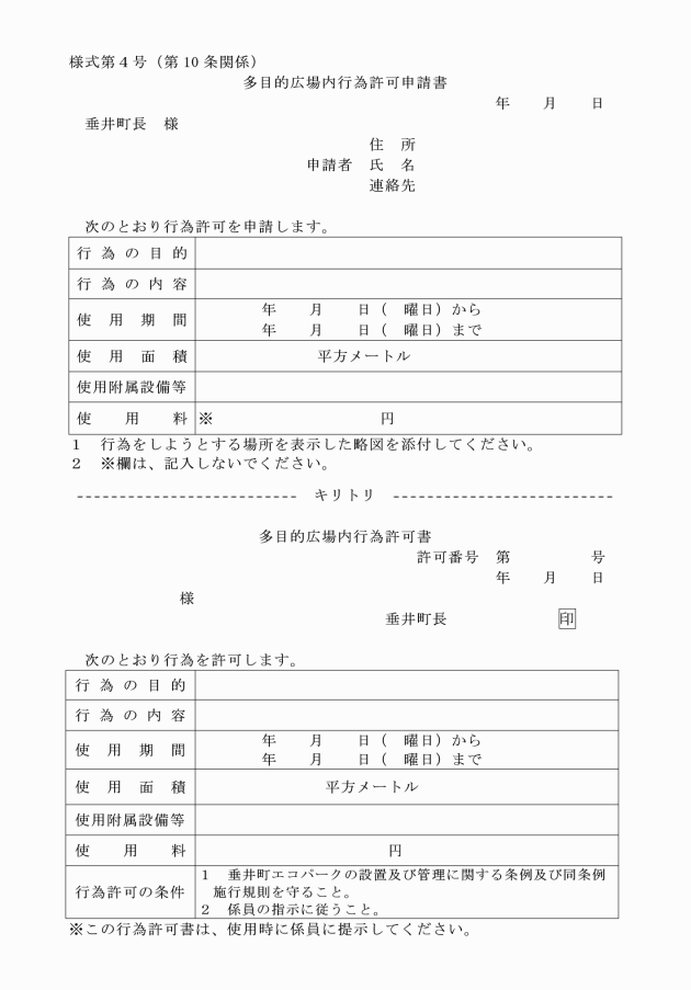 第10条 多目的広場において条例第13条第1項各号に掲げる行為をしようとする者は、多目的広場内行為許可申請書(別記様式第4号)を町長に提出しなければならない。