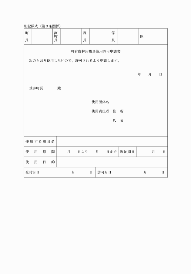 第3条 借受人は、使用の前少くとも3日前に別記様式によって使用許可申請書を町長に提出して許可を受けなければならない。