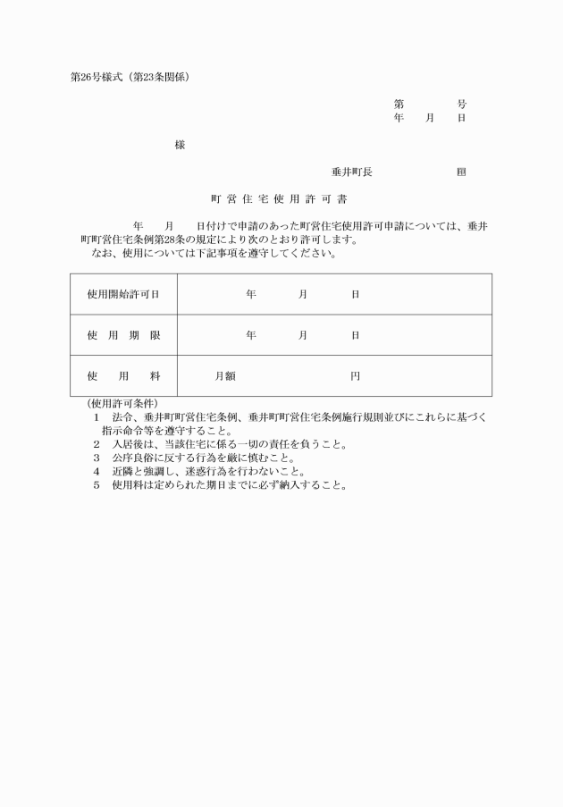 第23条 町長は、町営住宅の使用を許可した場合は、町営住宅使用許可書(別記第26号様式)を申請者に交付するものとする。